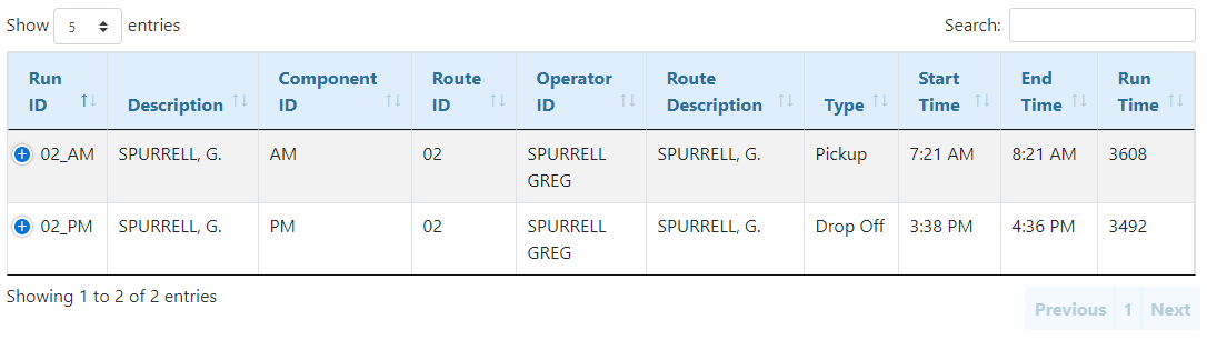 The Run Listing allows you to see detailed information about runs. The information includes the Run ID, route information, distance information, time information, number of stops, and rider information. This tool displays the same information as the Run Listing in BusPlanner’s Analysis menu.